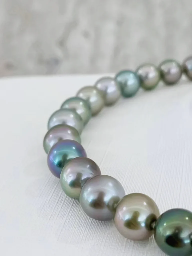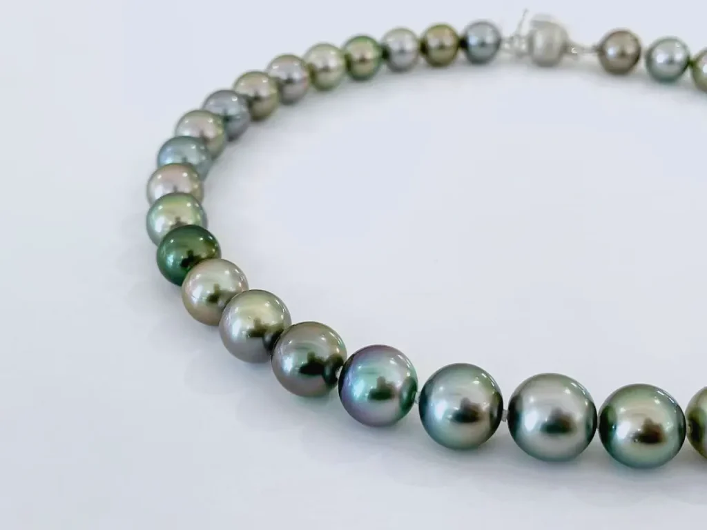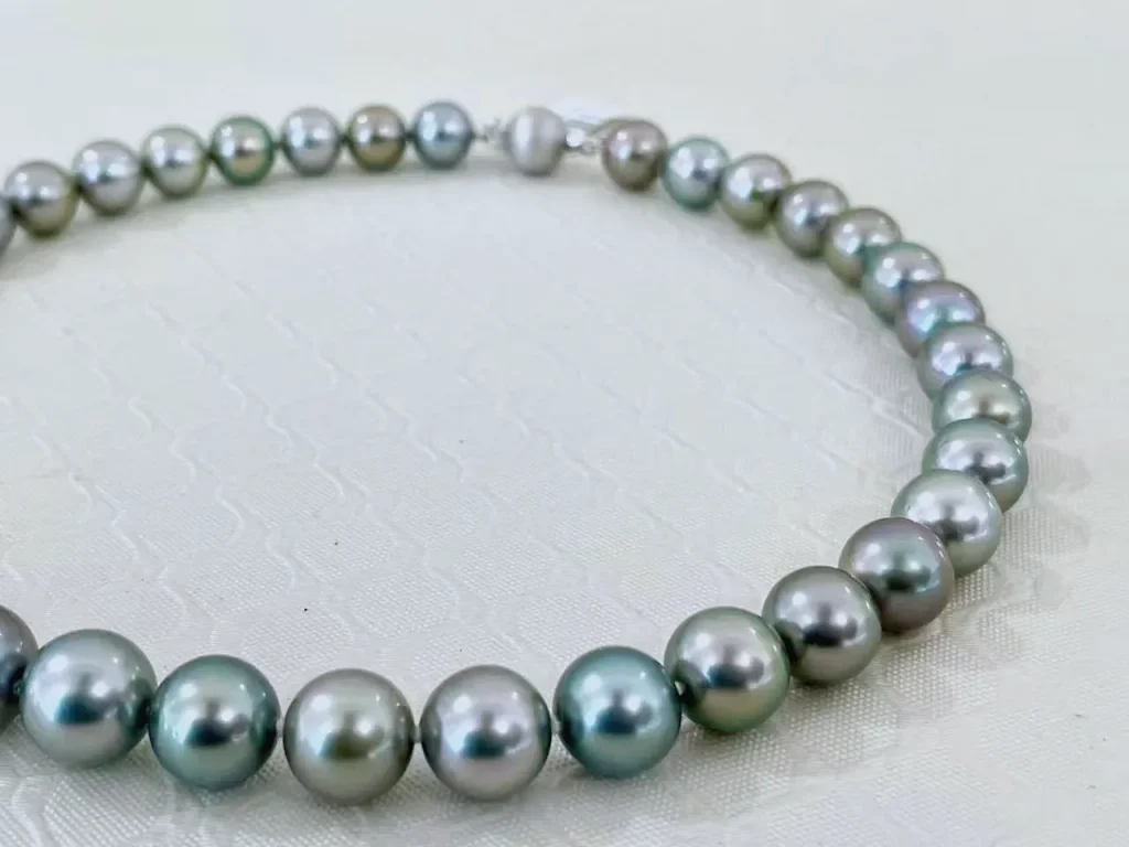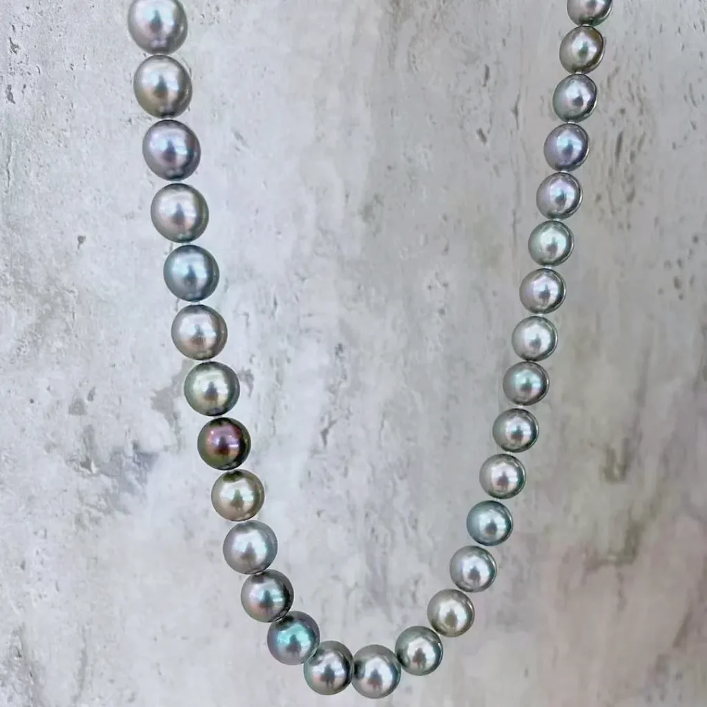 This black Tahitian pearl necklace is a stunning piece of jewelry. It features 37 near – round black Tahitian pearls, with sizes ranging from 9.0mm to 11.0mm.Black Tahitian pearls are highly prized for their deep, lustrous black color, often with beautiful overtones that give them a unique and captivating appearance.The pearls are strung together and complemented by a 14K white gold clasp.