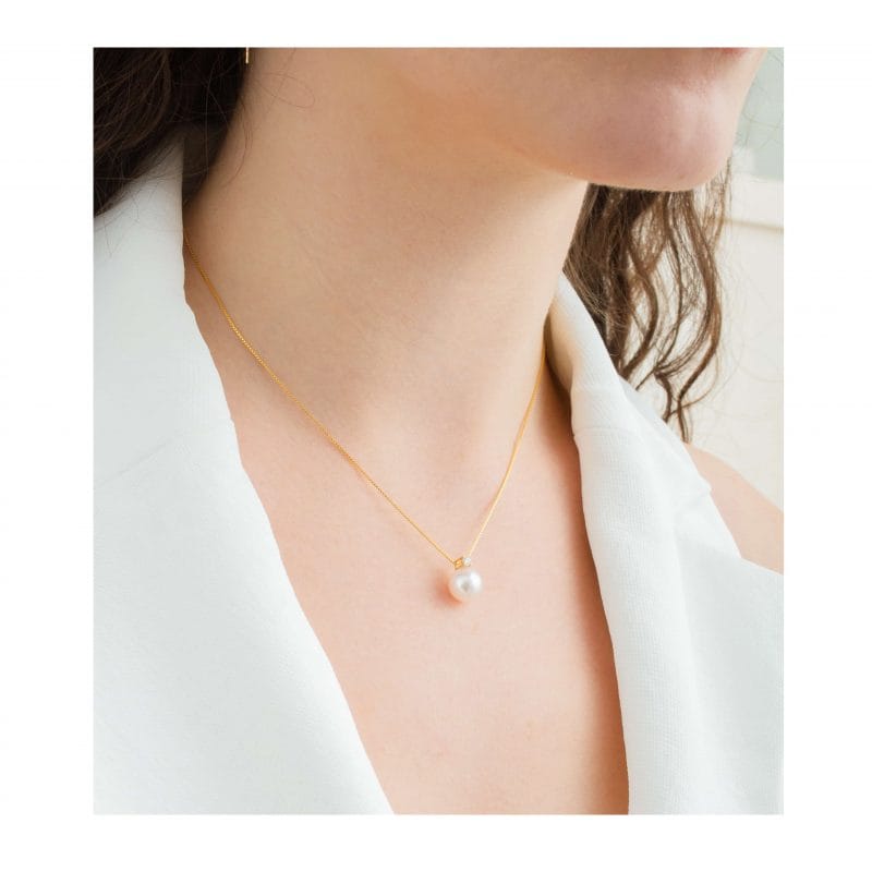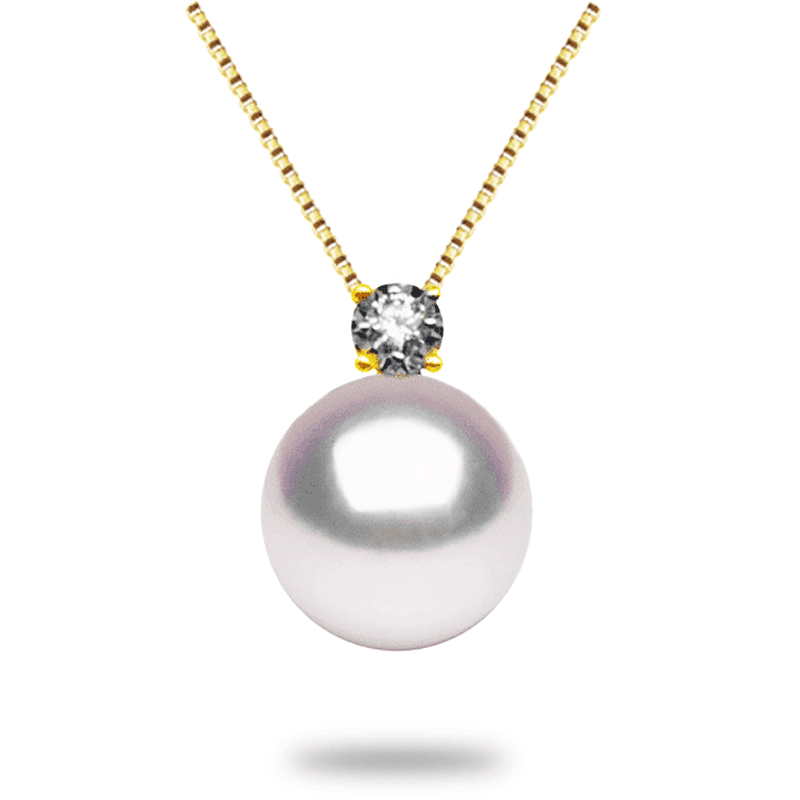 This Japanese Akoya Pearl pendant features a stunning 9mm-9.5mm white pearl. It has a smooth surface, round shape, and the highest lustre.With the setting of the round-cut diamond, it has embellished the Akoya Pearl and brings all eyes to the charming Pearl. The minimal design is ideal for any occasion, casual or formal.