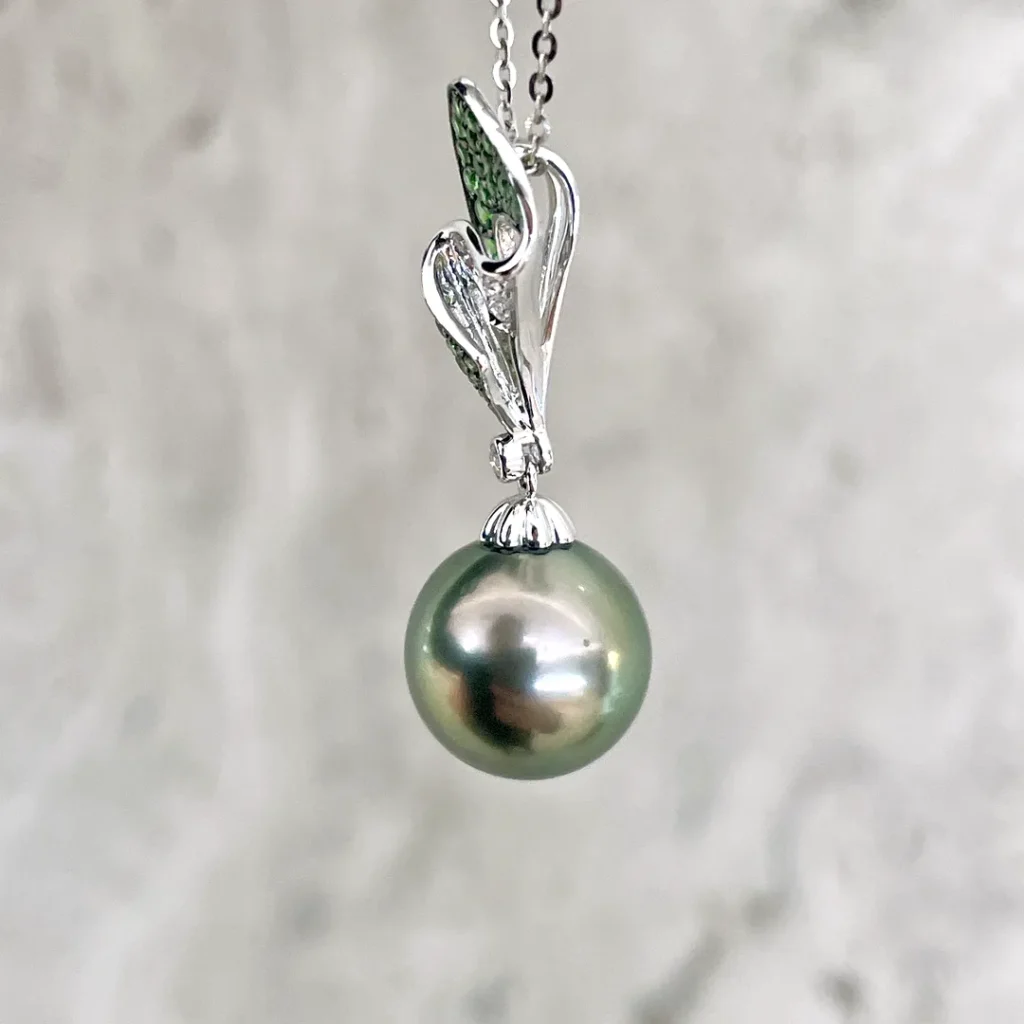 This “Black Tahitian Pearl Tsavorite & Diamond Pendant” features an 11.2mm round black Tahitian pearl, prized for its deep, lustrous sheen. Set in 18K white gold, the pendant boasts a striking design with vibrant tsavorite garnets and sparkling diamonds. The gemstones create a dazzling contrast, enhancing the pearl’s dark, alluring beauty and crafting a sophisticated, eye – catching piece.