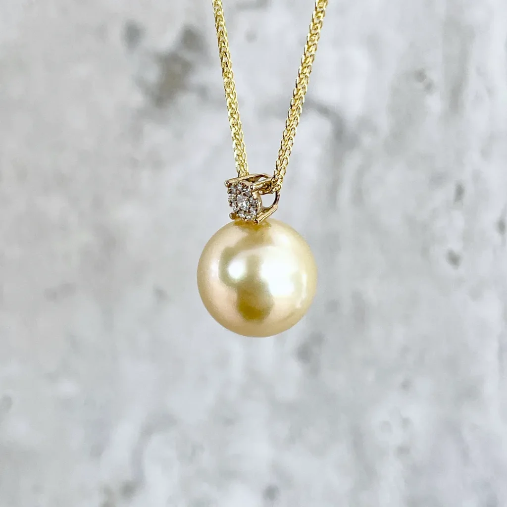 This elegant pendant features a lustrous 14mm Golden South Sea pearl, admired for its rich golden tone and radiant surface. The pearl is topped with a cluster of brilliant round diamonds set in 18K yellow gold, adding sparkle and refinement to the design. The combination of the warm golden pearl and dazzling diamonds creates a timeless piece of jewelry, perfect for both everyday sophistication and special occasions.