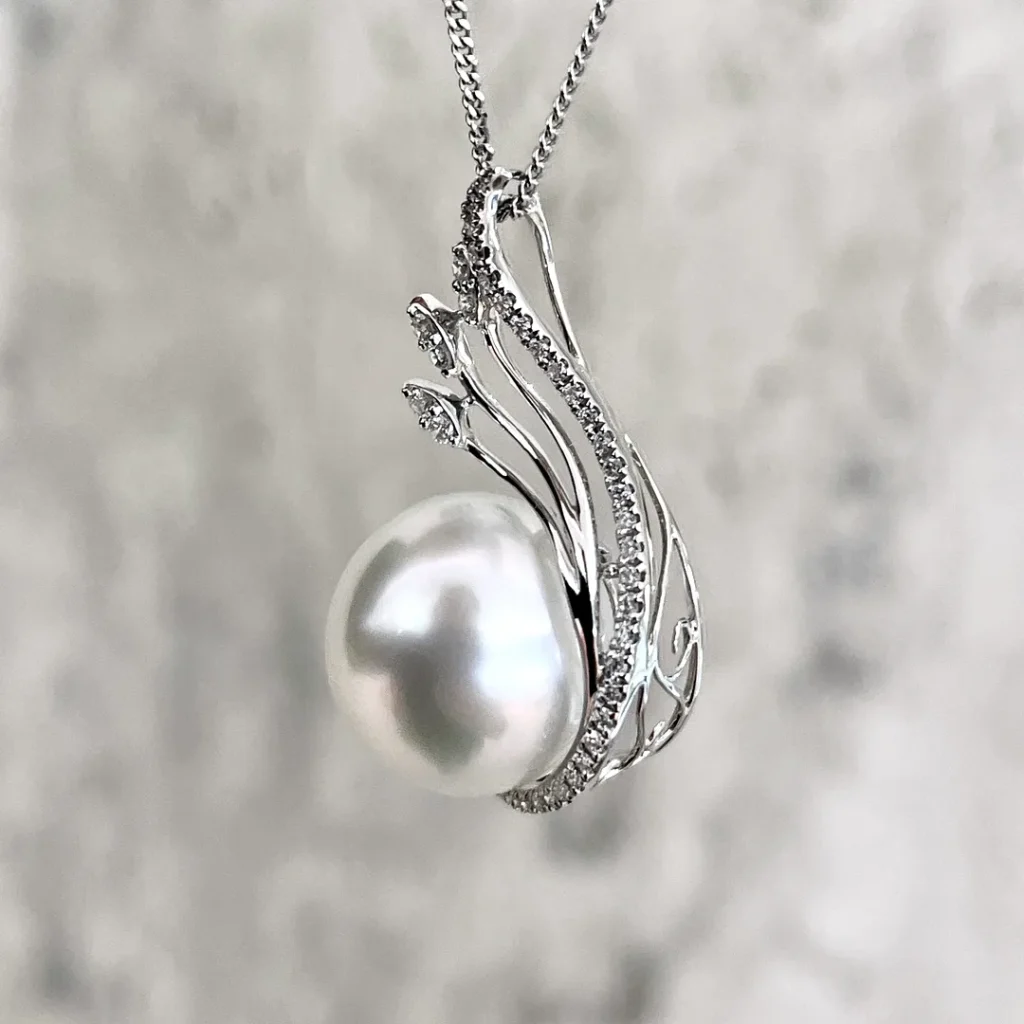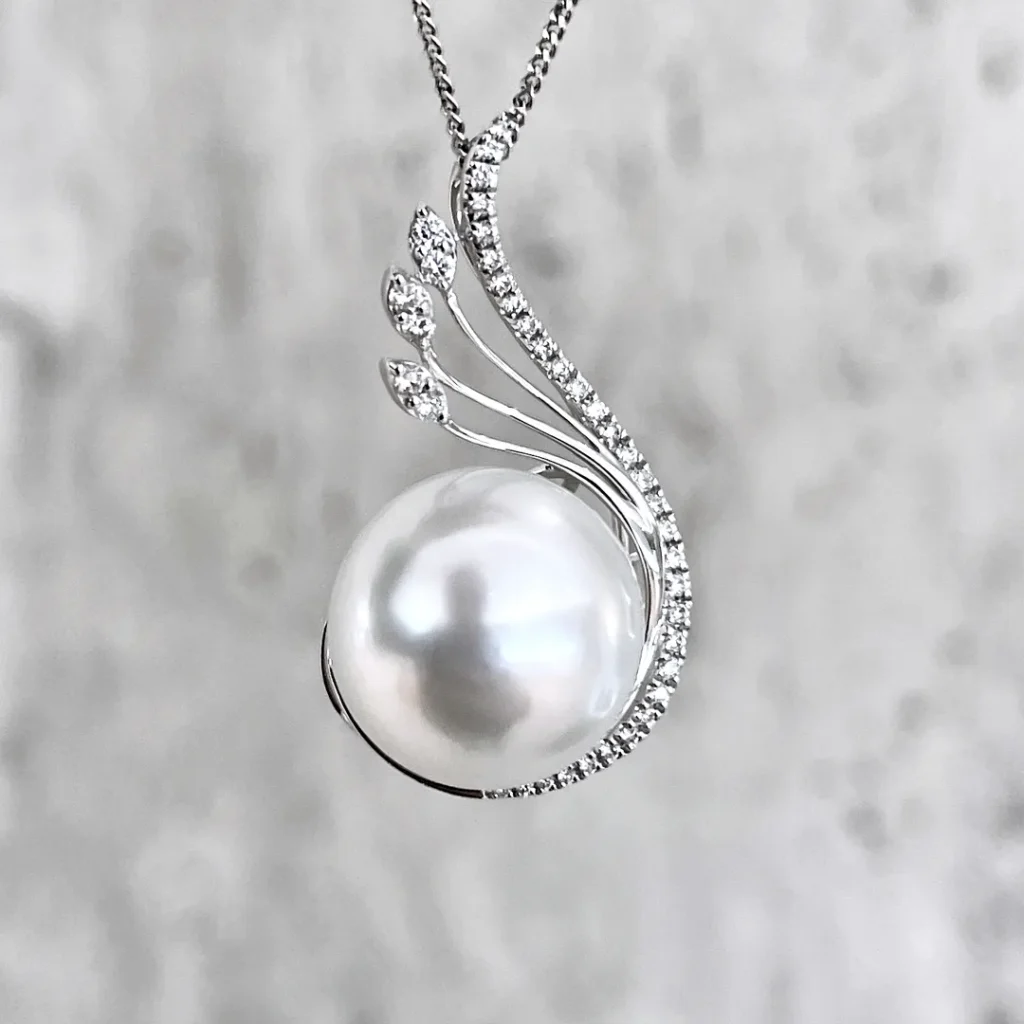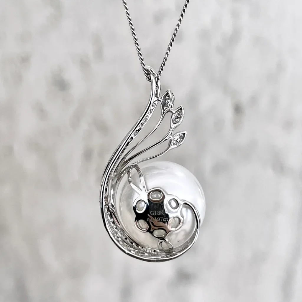 This pendant showcases a 13.3mm near-round white South Sea pearl, celebrated for its luminous, pearly white sheen and smooth surface. Set in an 18K white gold mounting, the design features elegant angel’s wing motifs. Delicate rows of diamonds adorn the wings, sparkling like celestial light. The pearl, nestled at the center of the winged design, seems to be cradled by a pair of divine wings, merging the pearl’s natural purity with the brilliance of diamonds and the sleek grace of white gold. It exudes timeless elegance and a sense of heavenly charm.