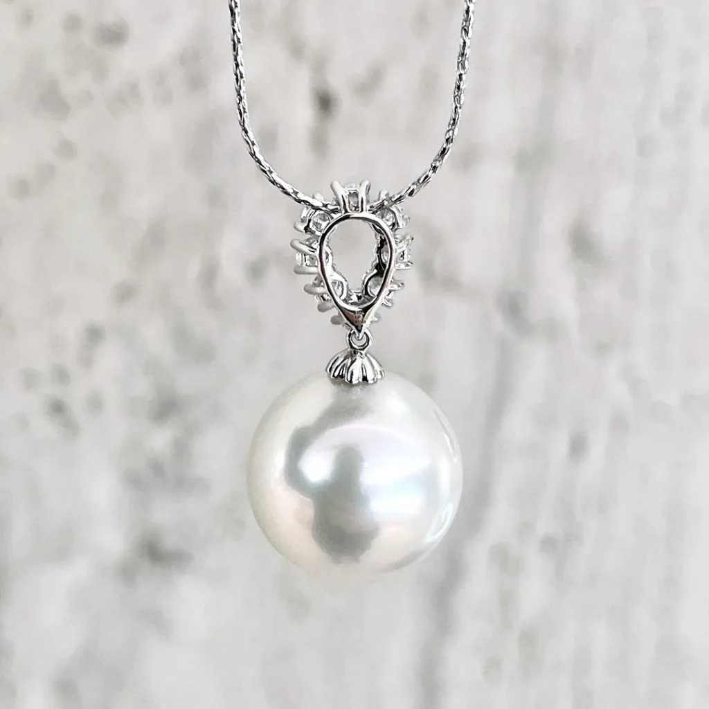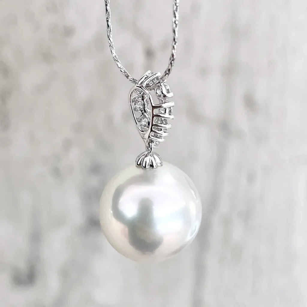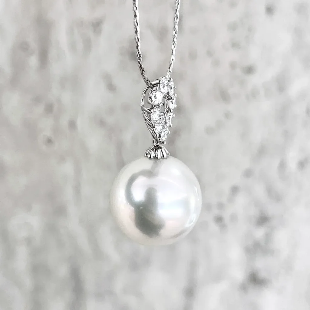 This pendant showcases a magnificent 16.3mm round white South Sea pearl, renowned for its luminous luster and flawless surface. Suspended from an 18K white gold setting, the pearl is graced by a delicate halo of sparkling diamonds. The diamonds are artfully arranged to form an elegant, open – shaped accent, catching the light to emit a brilliant glow. The design beautifully marries the pearl’s natural, opulent charm with the dazzling radiance of diamonds and the refined elegance of white gold, creating a timeless piece that exudes sophistication and grace, perfect for both special occasions and elevating everyday style.