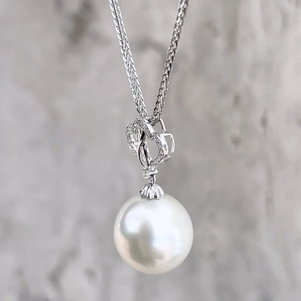 This White South Sea Pearl Intertwined Hearts Pendant is a dazzling piece of jewelry. It showcases a 13.2mm near – round White South Sea Pearl with a beautiful, lustrous glow. The pearl is suspended from an 18k white gold setting that features two intricately intertwined hearts. These heart shapes are adorned with sparkling diamonds, which add a brilliant touch and enhance the romantic and elegant design. The combination of the radiant pearl, the polished 18k white gold, and the glittering diamonds creates a pendant that is both luxurious and full of sentimental charm.