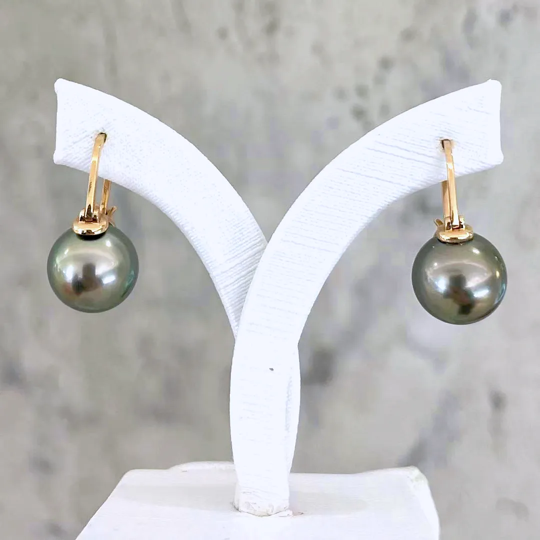 These black Tahitian pearl hoop earrings showcase exquisite craftsmanship. Each earring features a round black Tahitian pearl with a size ranging from 10 to 10.5mm. Black Tahitian pearls are renowned for their captivating dark hues, often with subtle overtones that add depth and allure.The pearls are elegantly suspended from 14K yellow gold hoops.The combination of the lustrous black pearls and the rich yellow gold creates a striking contrast, making these earrings a timeless and sophisticated accessory suitable for both formal occasions and adding a touch of elegance to everyday wear.