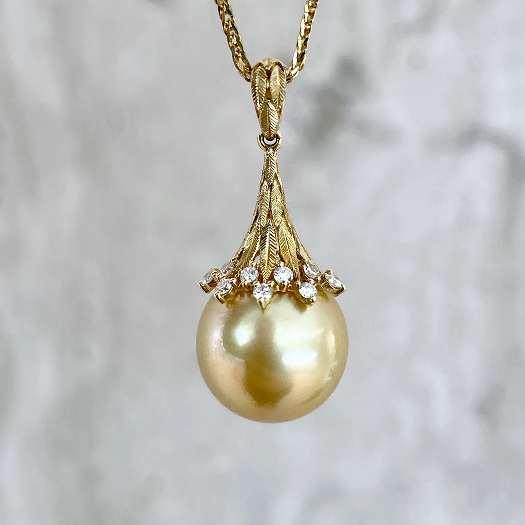 This exquisite pendant showcases a single 12.4mm Golden South Sea pearl, celebrated for its rich, natural golden hue and exceptional lustre. The pearl is gracefully set in an 18K yellow gold filigree design setting, with delicate filigree details that add elegance and sophistication. Its thick nacre gives the pearl a mirror-like surface and radiant glow. Suspended from a matching gold chain, this pendant embodies timeless luxury and refined craftsmanship, making it an ideal piece for both everyday elegance and special occasions.