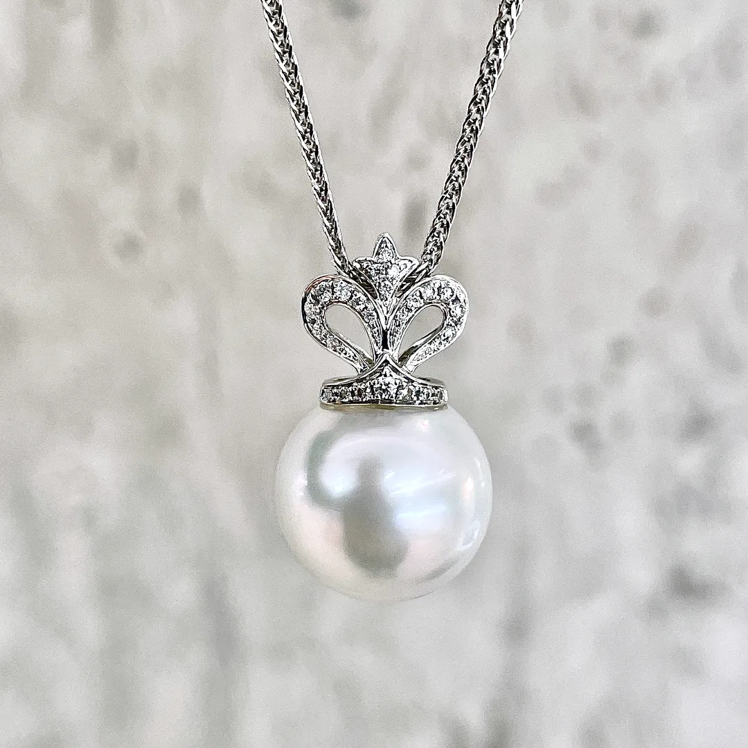 This pendant features a stunning white South Sea pearl, celebrated for its large size in 13.7mm, round shape, and ethereal, luminous white sheen that seems to glow from within. The pearl is elegantly suspended from an 14K white gold setting crafted into a regal crown design. This crown is intricately adorned with a multitude of sparkling diamonds, which catch the light beautifully and enhance the pendant’s overall grandeur. The combination of the pearl’s pure, celestial radiance and the diamond-encrusted crown creates a piece that exudes royal elegance, timeless beauty, and the unparalleled allure of one of nature’s most precious gems. Perfect for special occasions, this pendant is a masterpiece that blends exquisite craftsmanship with the inherent charm of South Sea pearls.
