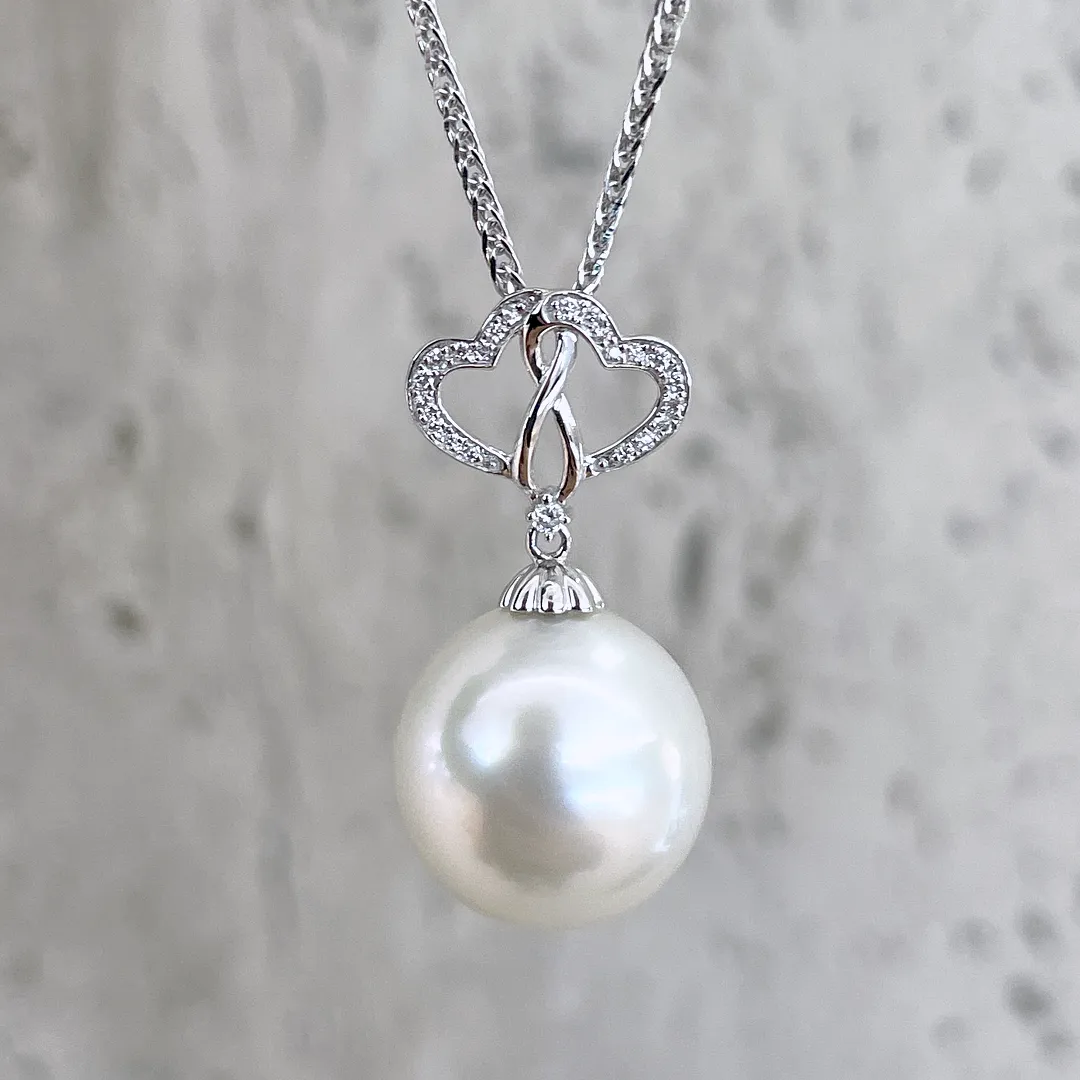 This White South Sea Pearl Intertwined Hearts Pendant is a dazzling piece of jewelry. It showcases a 13.2mm near – round White South Sea Pearl with a beautiful, lustrous glow. The pearl is suspended from an 18k white gold setting that features two intricately intertwined hearts. These heart shapes are adorned with sparkling diamonds, which add a brilliant touch and enhance the romantic and elegant design. The combination of the radiant pearl, the polished 18k white gold, and the glittering diamonds creates a pendant that is both luxurious and full of sentimental charm.